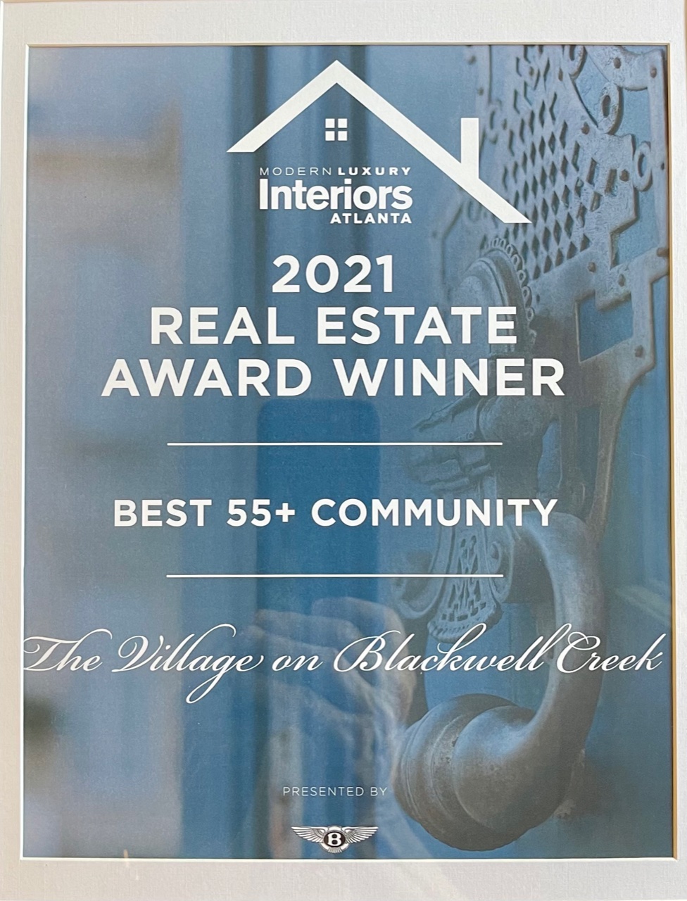 On Thursday, August 26, 2021, The Village on Blackwell Creek was selected as the 2021 Real Estate Award Winner for The Best 55+ Community in the metro Atlanta area. The event was hosted by Modern Luxury Interiors, Atlanta, and held at the Atlanta Decorative Arts Center (ADAC) in Buckhead.